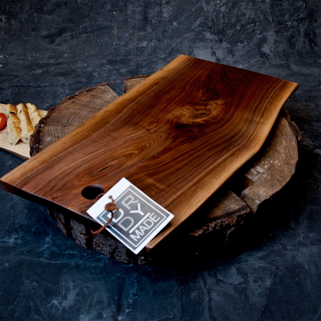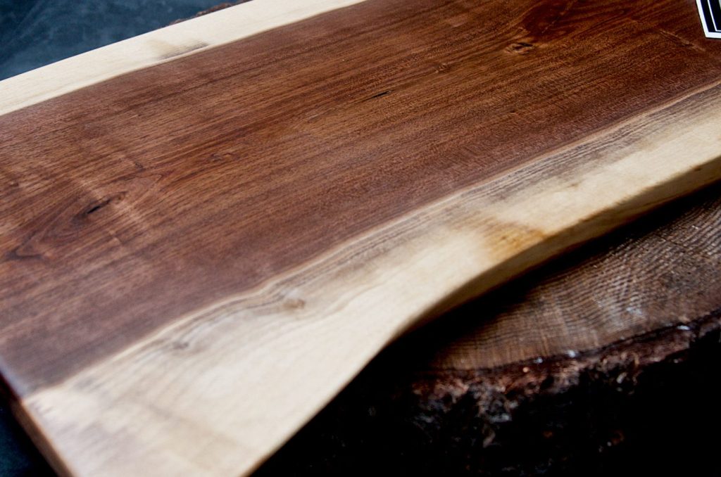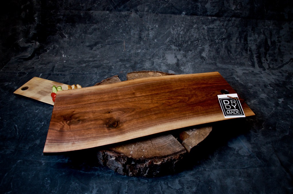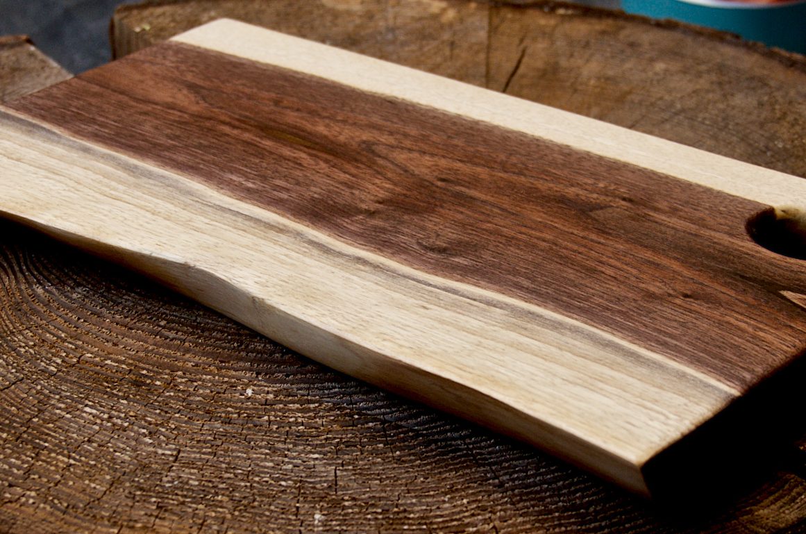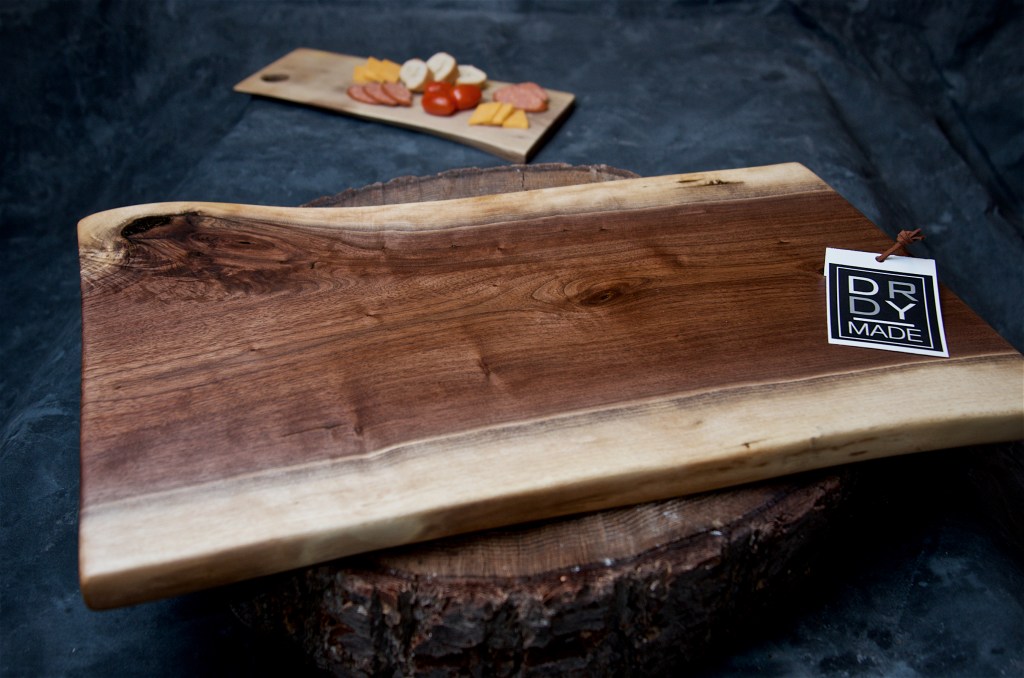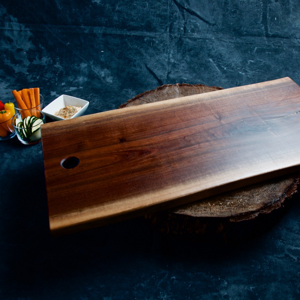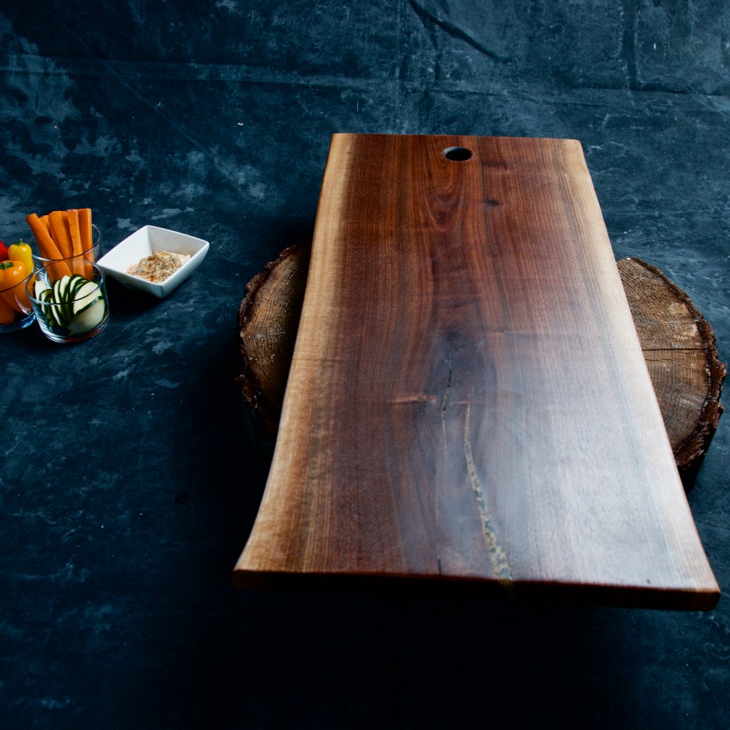 Our boards are locally sourced, live-edge Walnut or Maple hardwood. Hand selected for their distinct characteristics and grain pattern. Each board is honed and sanded with multiple courses of sandpaper until smooth. We finish each board with multiple coats of food grade oils and seal with bees wax, coconut oil, pure mineral oil and vitamin E.