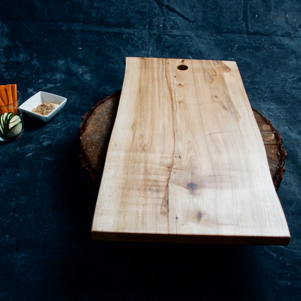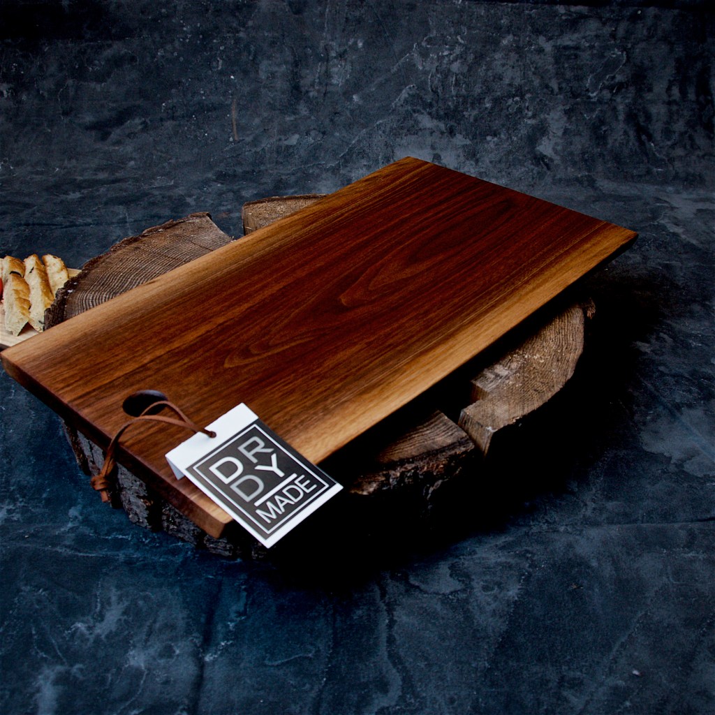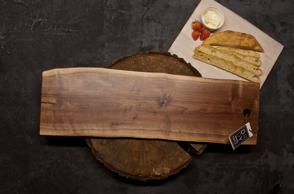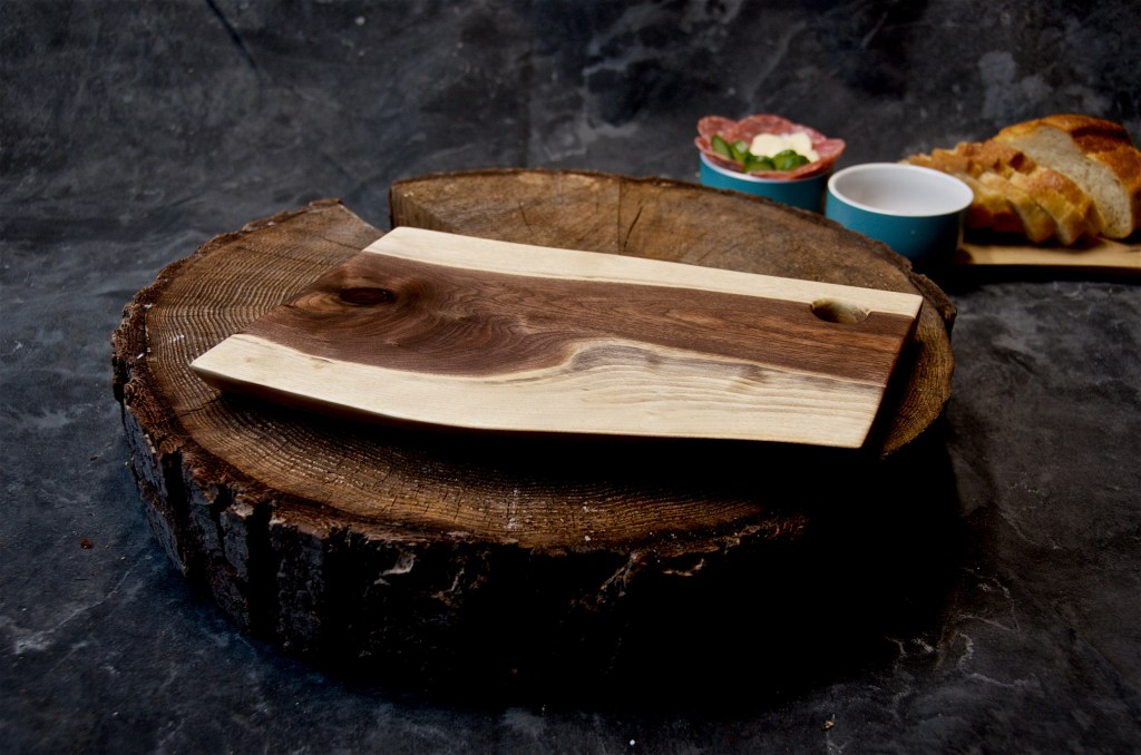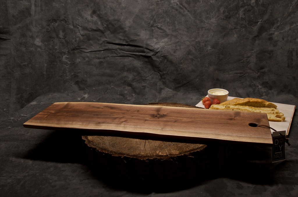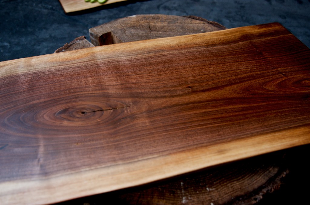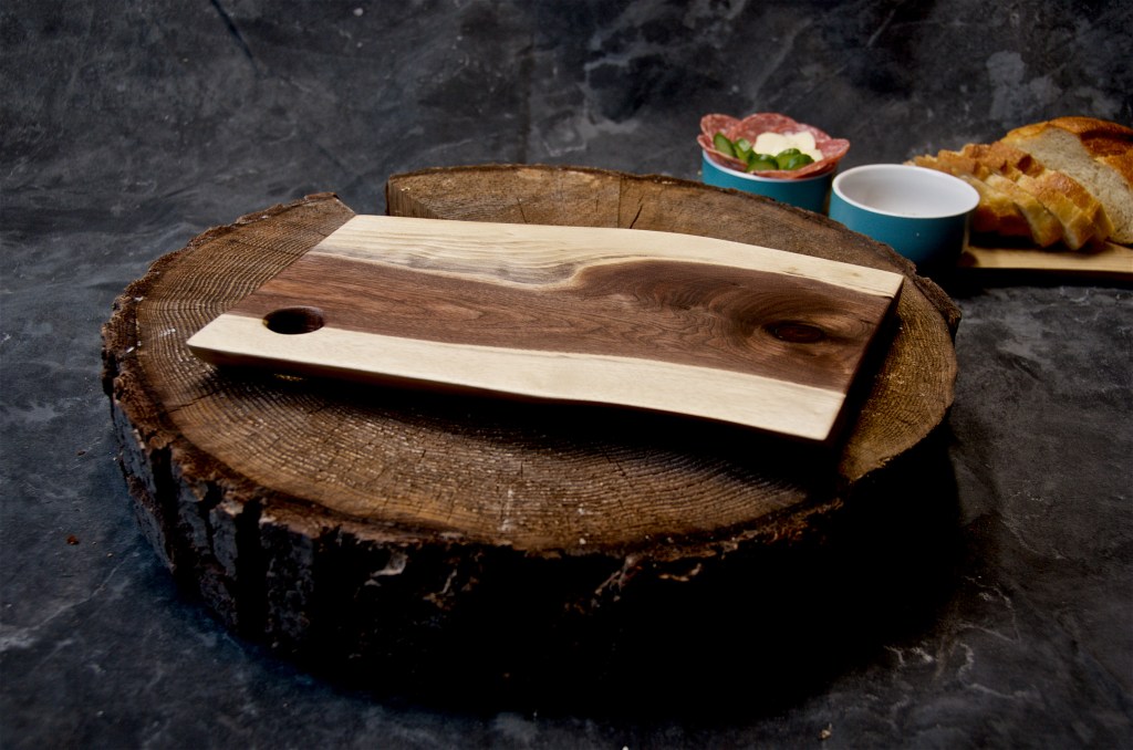 Our boards are locally sourced, live-edge Walnut or Maple hardwood. Hand selected for their distinct characteristics and grain pattern. Each board is honed and sanded with multiple courses of sandpaper until smooth. We finish each board with multiple coats of food grade oils and seal with bees wax, coconut oil, pure mineral oil and vitamin E.