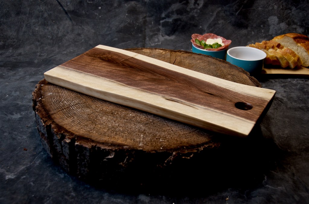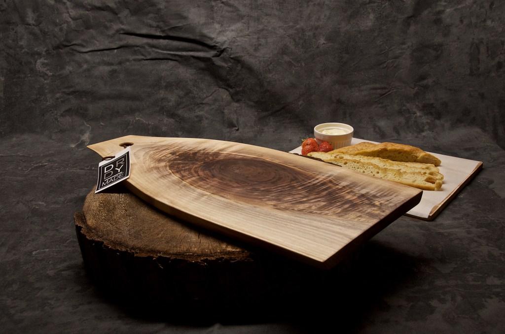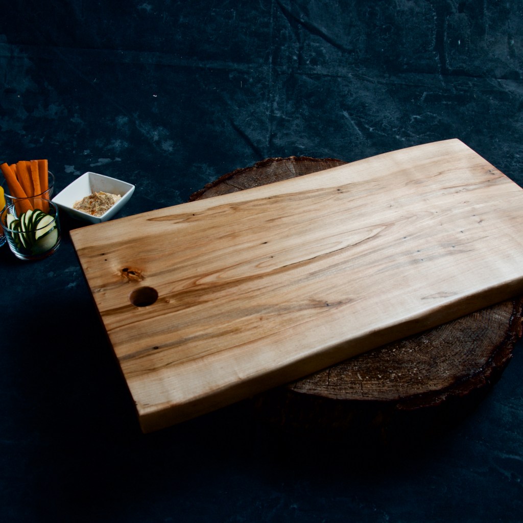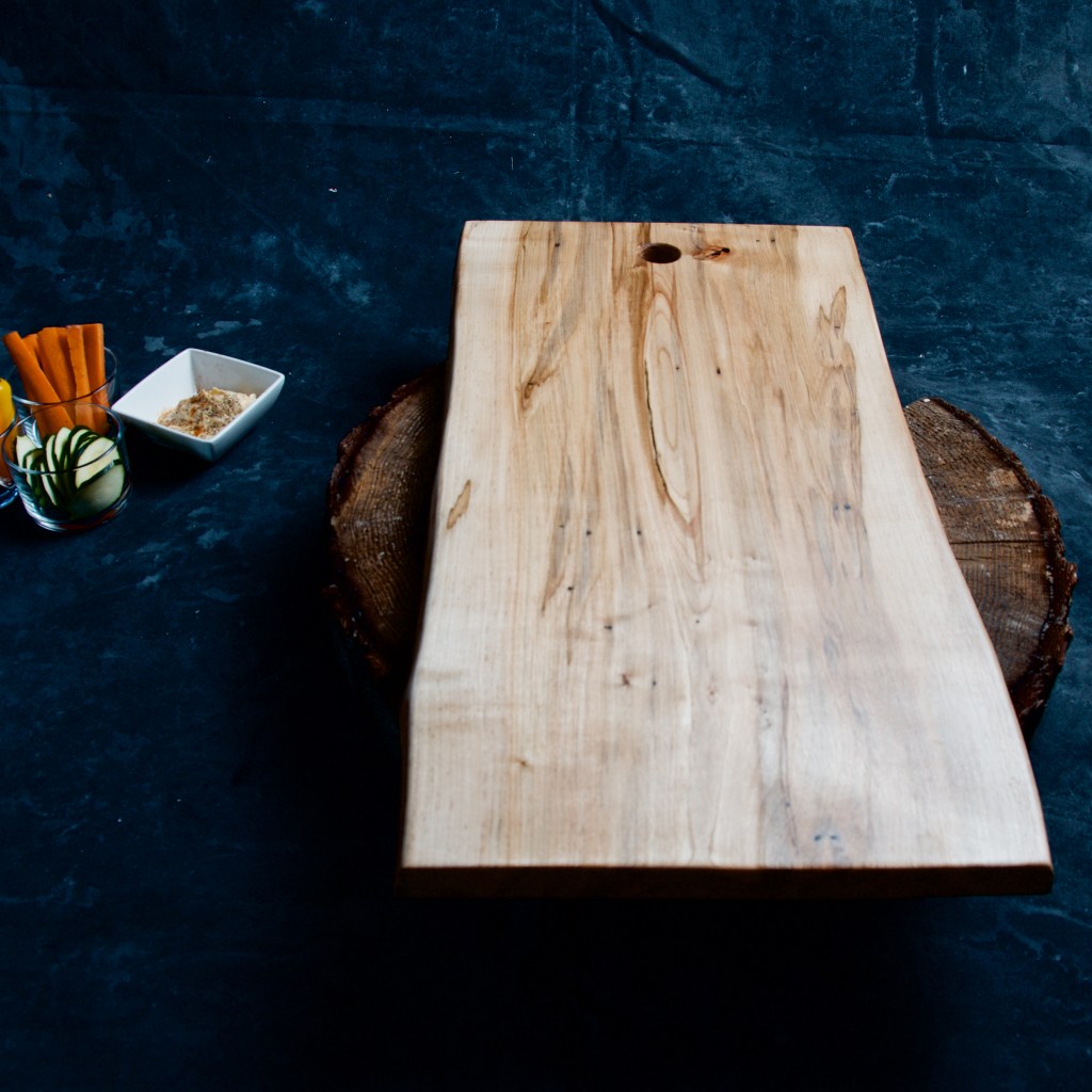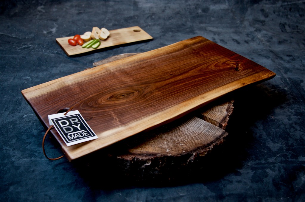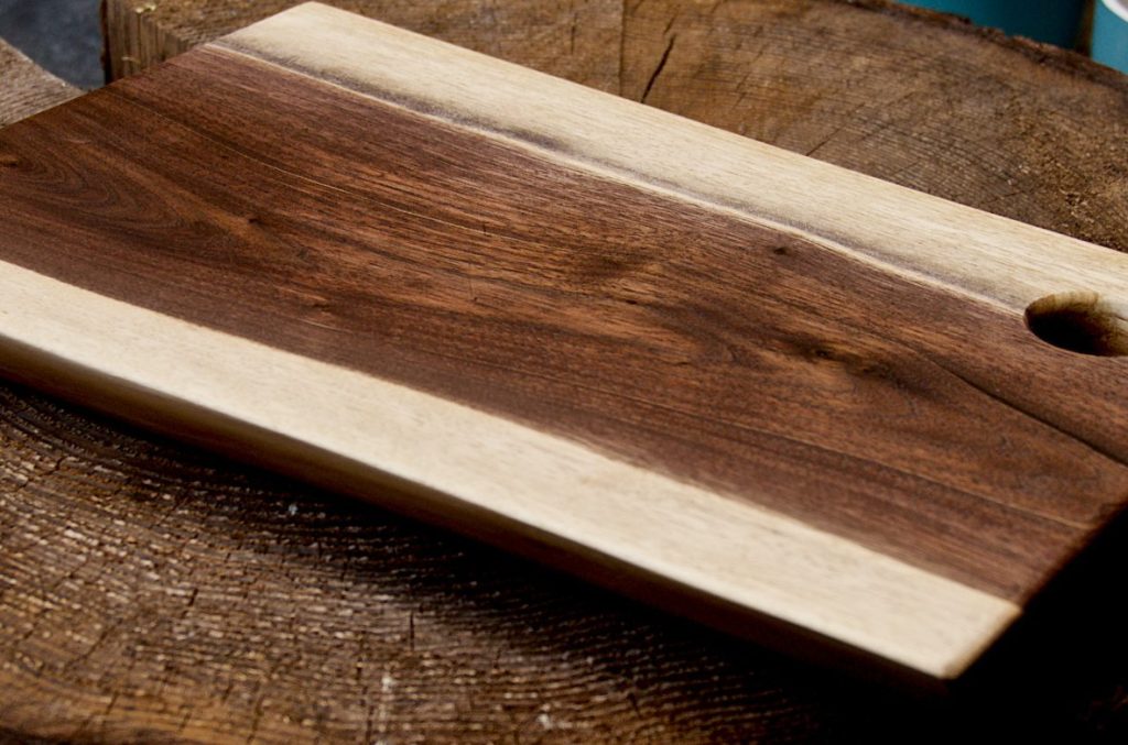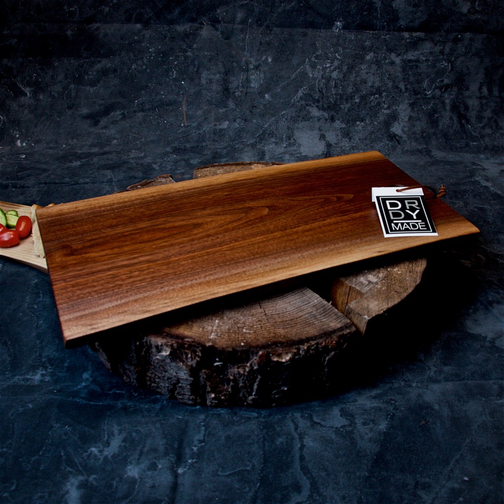 Our boards are locally sourced, live-edge Walnut or Maple hardwood. Hand selected for their distinct characteristics and grain pattern. Each board is honed and sanded with multiple courses of sandpaper until smooth. We finish each board with multiple coats of food grade oils and seal with bees wax, coconut oil, pure mineral oil and vitamin E.