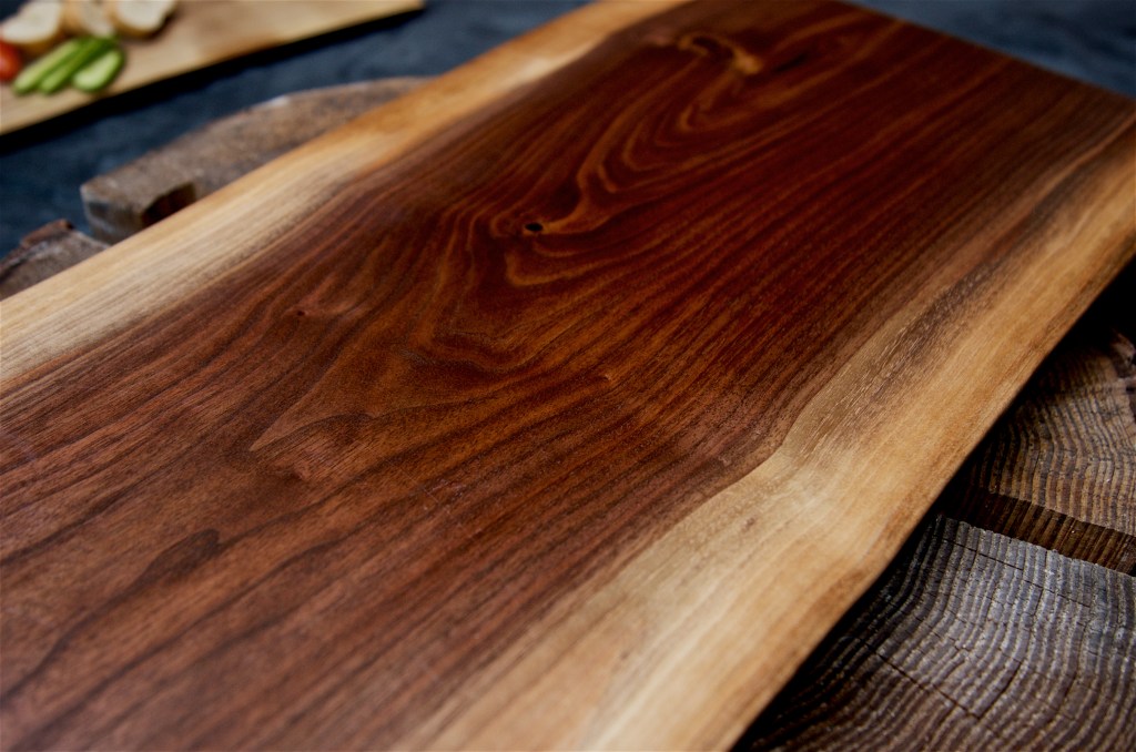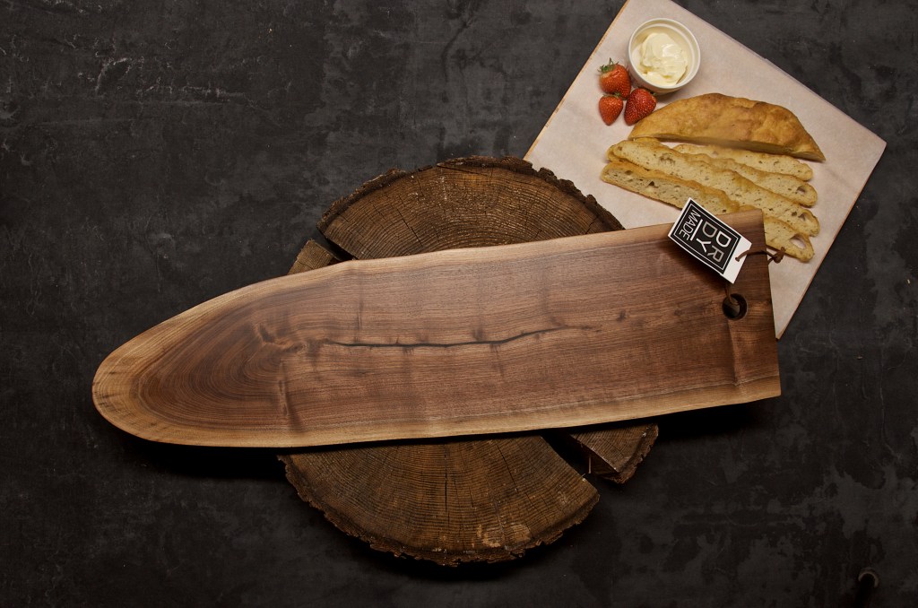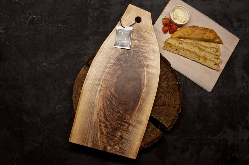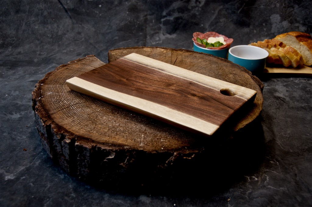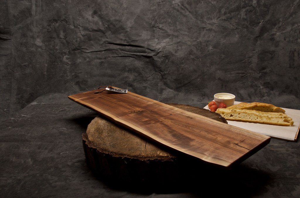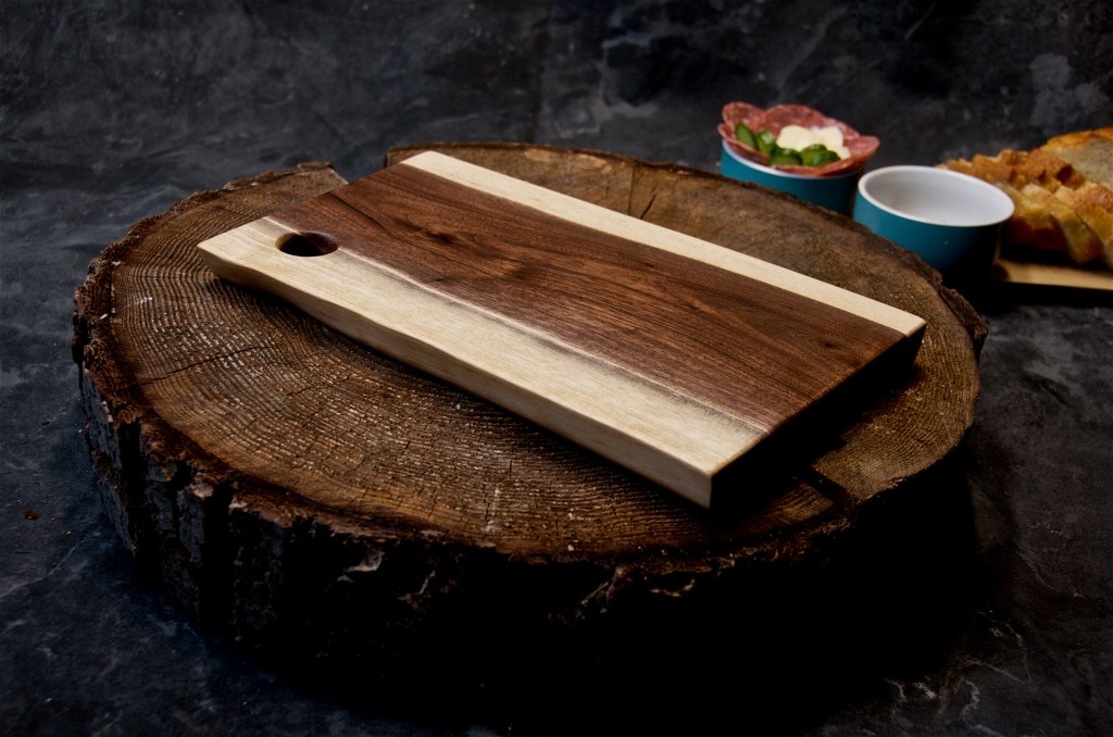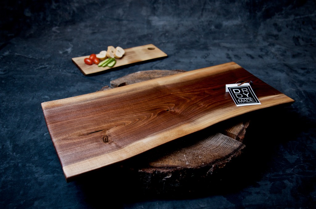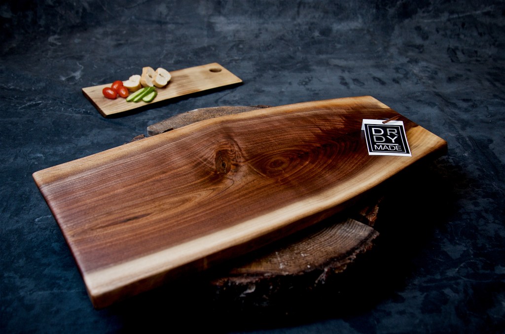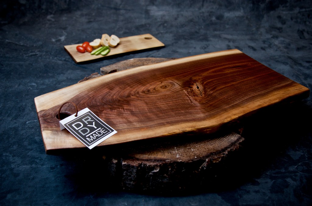Our boards are locally sourced, live-edge Walnut or Maple hardwood. Hand selected for their distinct characteristics and grain pattern. Each board is honed and sanded with multiple courses of sandpaper until smooth. We finish each board with multiple coats of food grade oils and seal with bees wax, coconut oil, pure mineral oil and vitamin E.